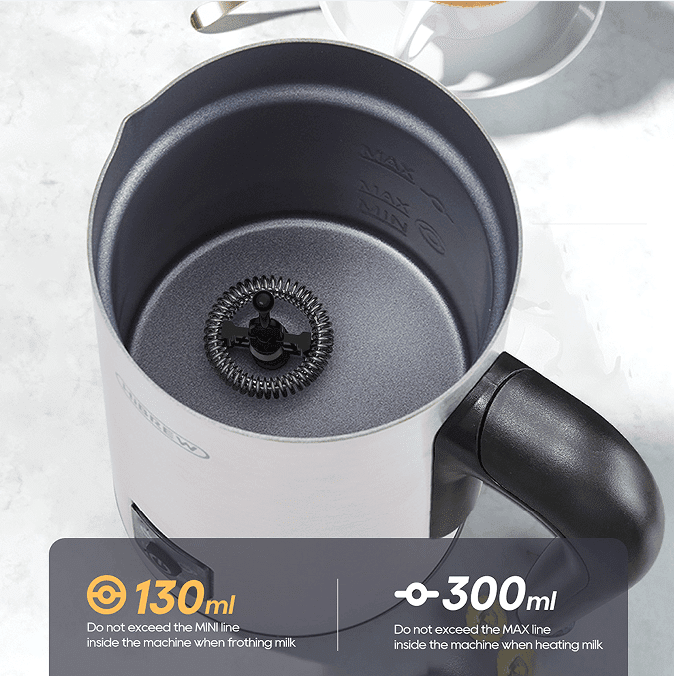 The steamer can hold up to 150 ml of sparkling milk and 300 ml of heated milk. For better foaming, it is recommended to use> 6% in whole milk.(Note: Overdose can cause overflow).