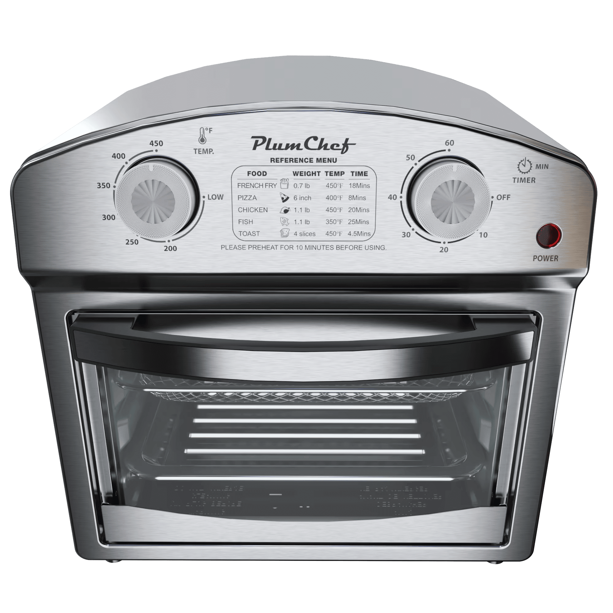 3. Dual Knobs for Simple Operation The two easy-to-use knobs let you control the temperature (up to 450°F) and set the timer for up to 60 minutes, ensuring precise cooking every time. The preset modes for French fries, pizza, chicken, fish, and toast offer additional convenience.